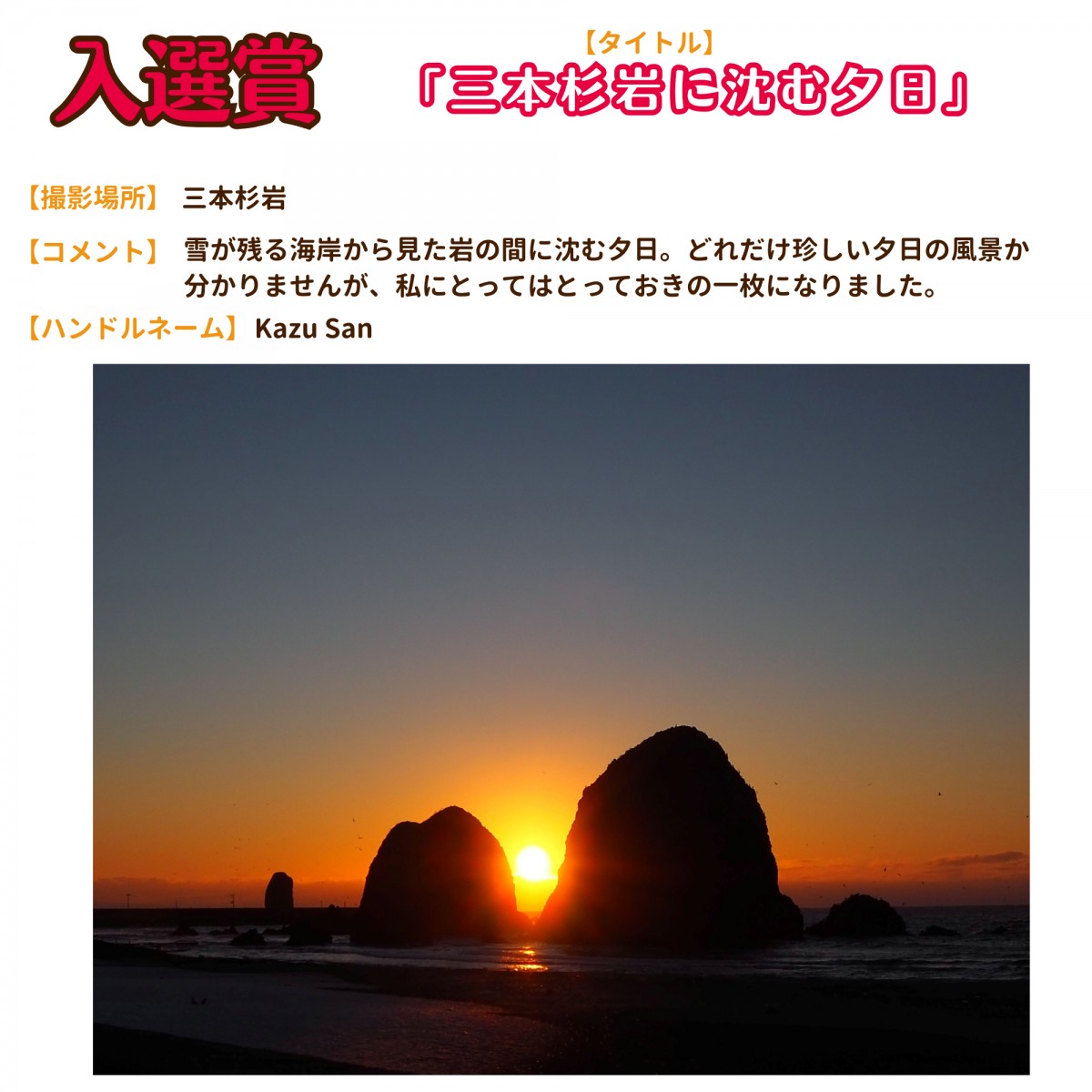 タイトル「三本杉岩に沈む夕日」